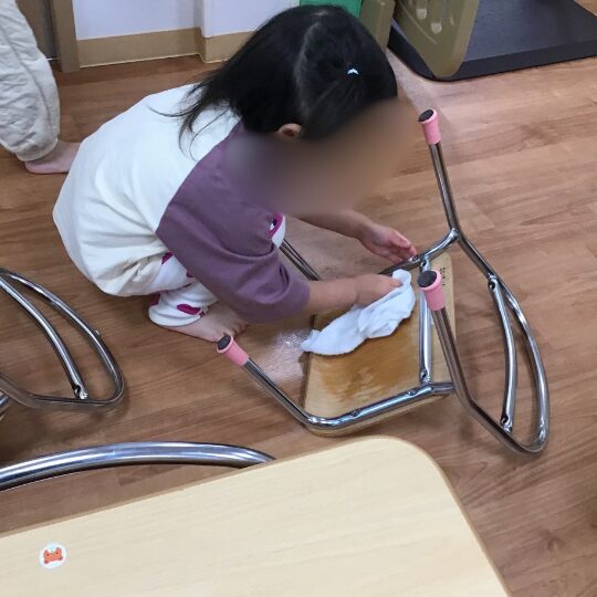 今年の2歳児クラスは女の子ばかりということもあり、 「ここも拭いた方がいいよ」と声をかけ合いながら、 椅子の裏や窓など、細かいところにも気がついて丁寧に拭く姿が見られました。