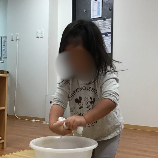 2歳児クラスでは、くぼたのうけんの活動の一環として「しぼる」という取り組みを行っています。
