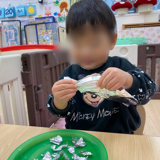アルミホイルならではの光の反射や質感が感覚遊びの入口となり、気づけばみんな夢中で手を動かしていました。