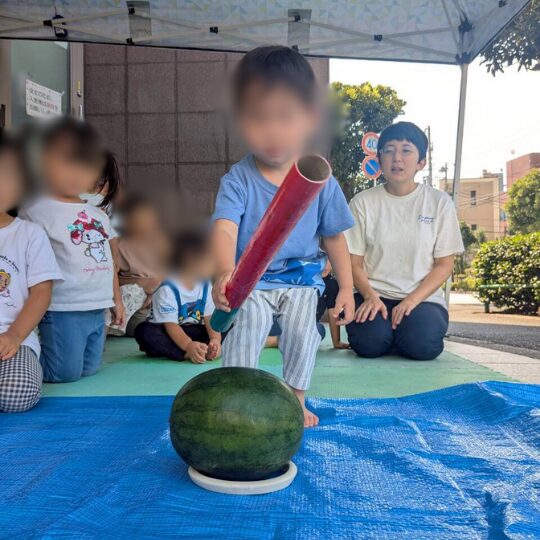 また、8月の終わりにはスイカ割り大会も開催しました。登場したのは小ぶりの「こだますいか」。