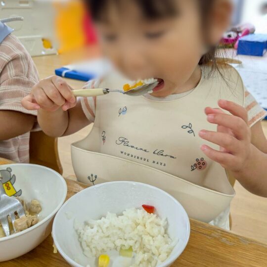 保育園では、たくさん体を動かした後の給食タイムも楽しみのひとつ。
