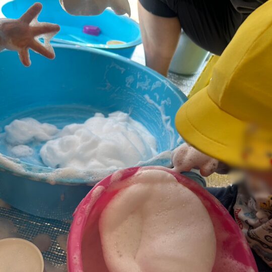 中には、腕やほっぺに泡をつけて「見て見て〜!」とにっこり笑う姿や、バケツに泡を入れてすくったり、ジャーッと流して遊んだりと、水と泡の不思議な動きを楽しむ様子も見られました。