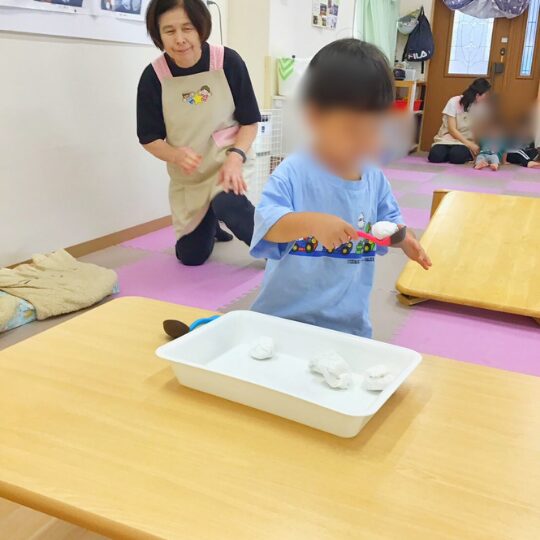 泡をのせてみたり、混ぜてみたり、すくってみたり…五感を使って自由に遊び込む子どもたちの姿が、とてもいきいきと輝いていました。