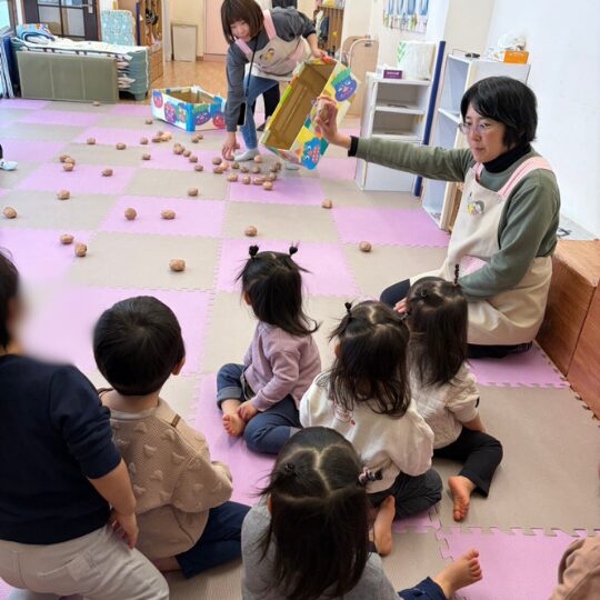 この日は、男の子も女の子もみんなで髪の毛をツノのように結び、とっても可愛い子鬼さんスタイルで節分あそびに参加しました🤍