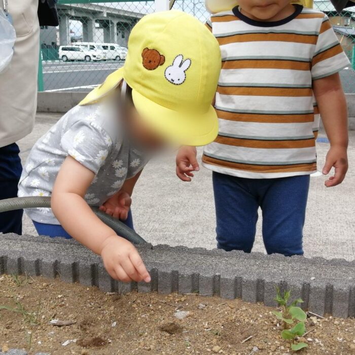 ジョウロやバケツを使って遊んだり、水鉄砲でお友だちとかけあいっこをしたりと、園庭には毎日のようににぎやかな笑い声が響いていました。