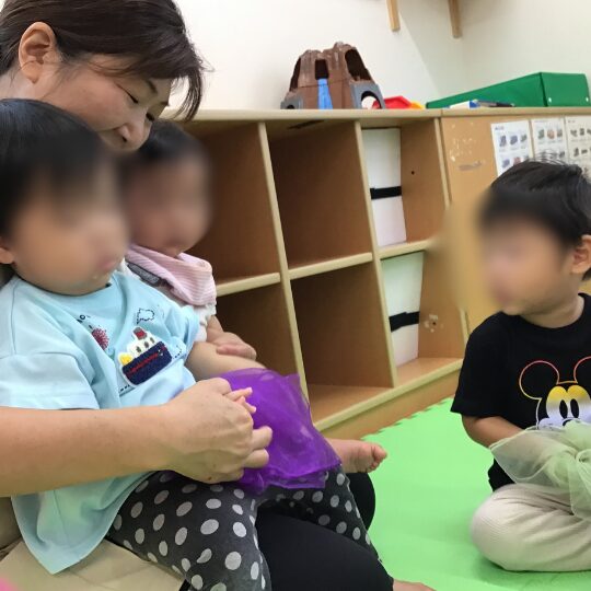 スライムあそびでは、ぷにぷにとした感触に驚いたり、指先でのばしたり丸めたりと、夢中になって遊ぶ姿が見られました。