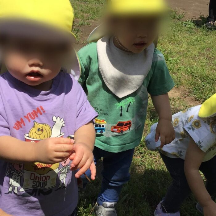 子どもたちは「みてみてー!おはな!」と指さしたり、しゃがんでじっくり虫を観察したり、思い思いに自然に親しんでいます。
