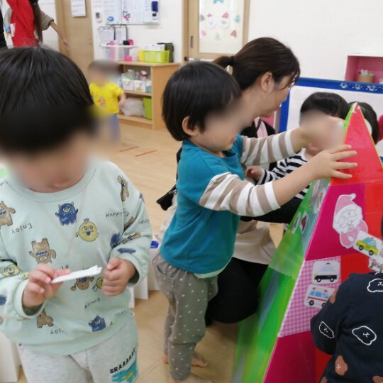 色分けゲームでは、赤・緑・白といったクリスマスカラーをテーマにした活動で、色の識別やルールのある遊びに挑戦。さらに「星を飾ろう」「オーナメントを並べよう」といった飾りつけゲームでは、サンタさんのお部屋を想像しながら、指先を使って上手に飾っていく子どもたちの姿がとても可愛らしかったです。