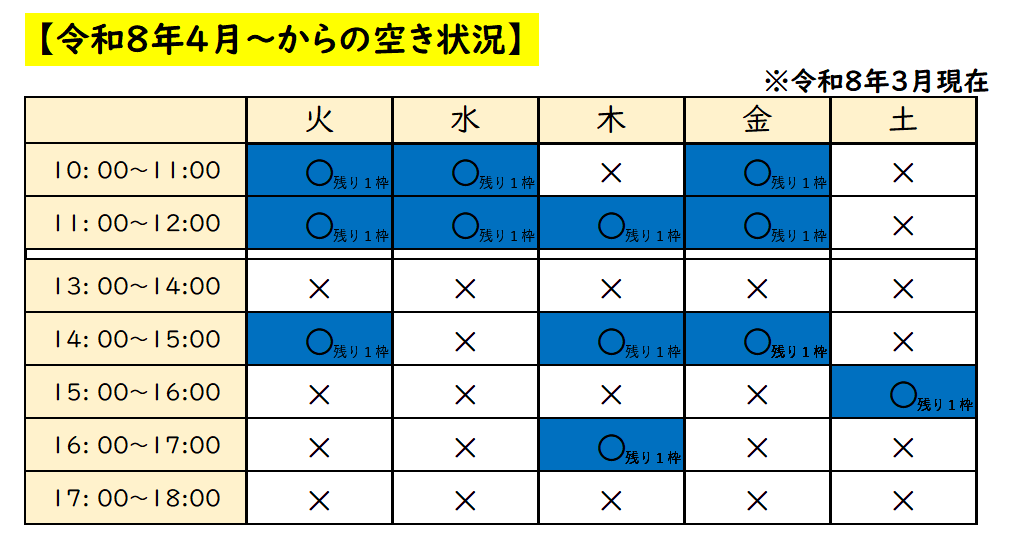 下記の画像は、フォレストキッズ川崎教室の現在の受け入れ可能状況を示したものです。(3月時点)
